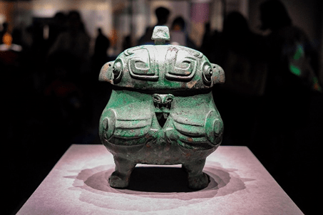 The exhibition shows off a series of bronzes found at a place called Sanxingdui in Sichuan province in 1986, which were seemingly demonstrative of the ancient culture of Shu (蜀). The items discovered included ancient carved jades, weapons, and scorched bones and tusks, which appear to have been deliberately destroyed and buried in pits.